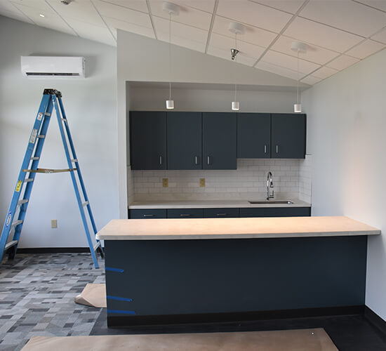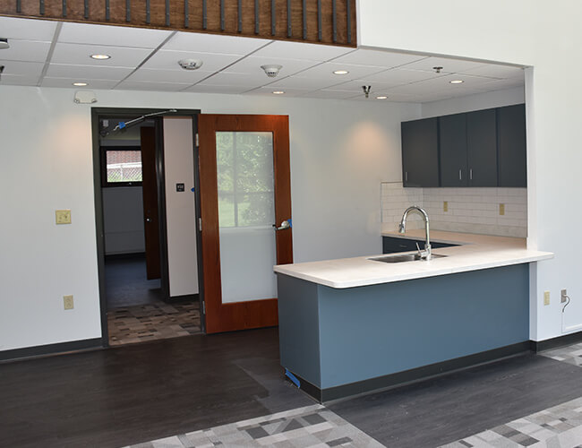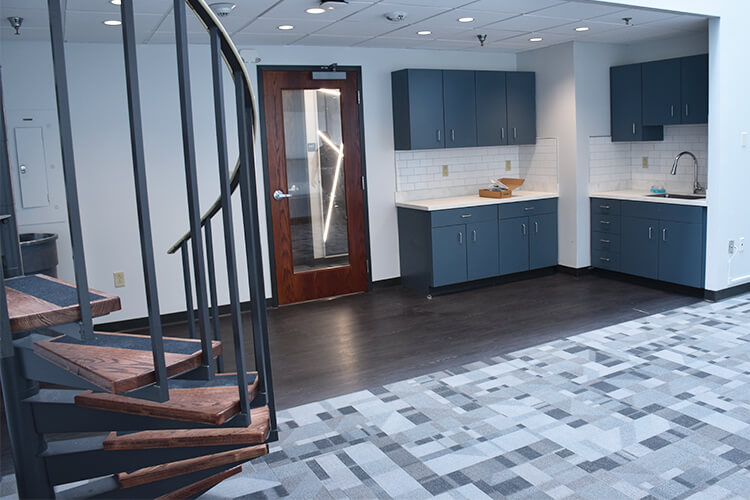 | Kitchen | Three lounges are outfitted with a sink, toaster oven, and cabinet storage |