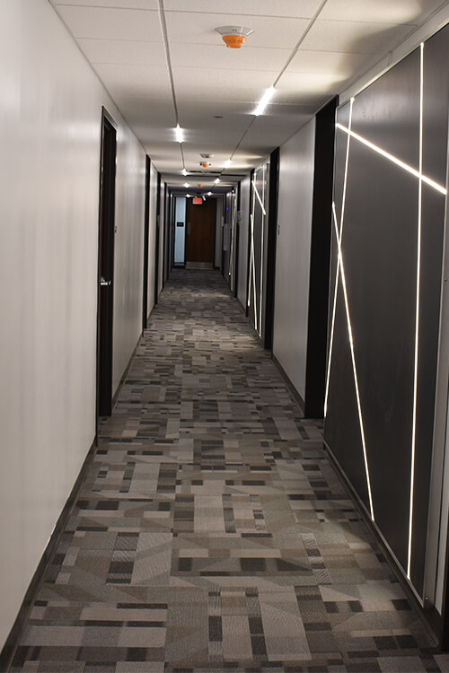 | Lounges | One large lounge at one end of each floor with 60" flat-screen TVs. Small lounge areas are available at the other end of the hallways. |