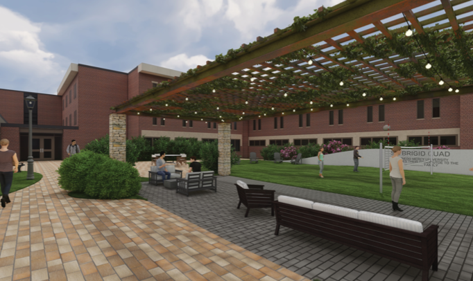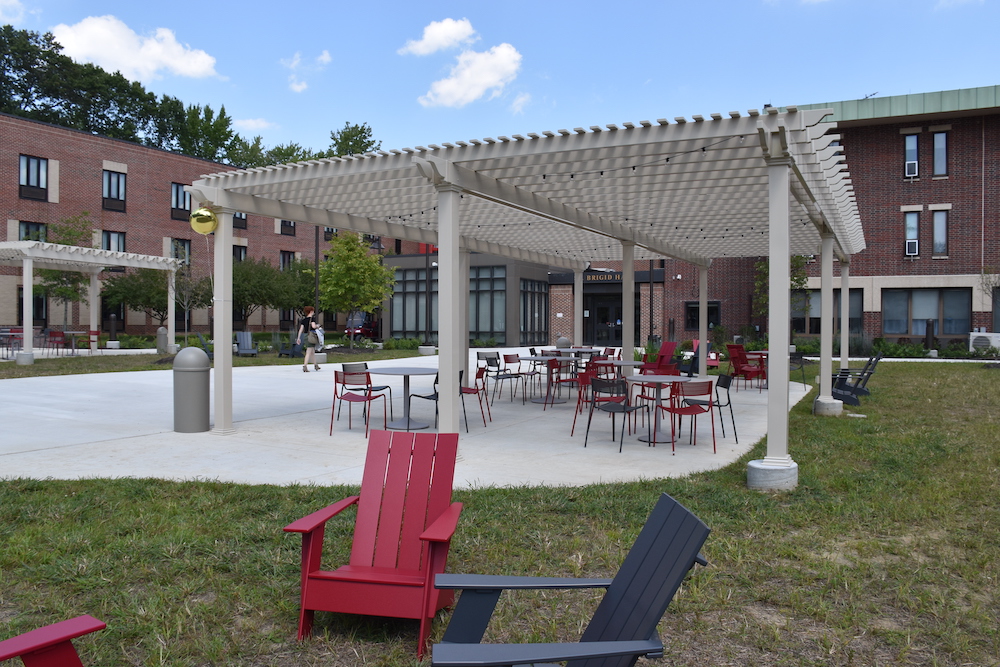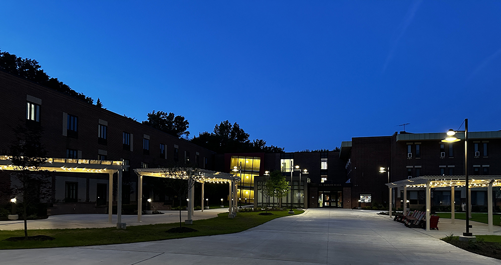 St. Brigid Hall offers suite-style living with semi-private bathrooms and full-functioning kitchens on every floor. If you’d rather not prepare your own late-night snacks, the Valley Pizza Co. is a short walk away. Right outside, you can enjoy our newly renovated outdoor spaces that offer plenty of spots to relax, eat, or study!